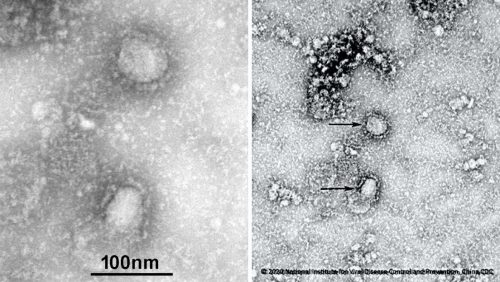 Nelle foto sottostanti, troviamo immagini reali al microscopio elettronico non elaborate artisticamente di SarsCov2 e di alcuni esosomi, praticamente indistinguibili. I virus nelle prime due foto in alto, diffuse dai cinesi: gli esosomi nelle tre piccole più in basso. Si trovano in rete digitando “virus foto reali” ed “esosomi”
